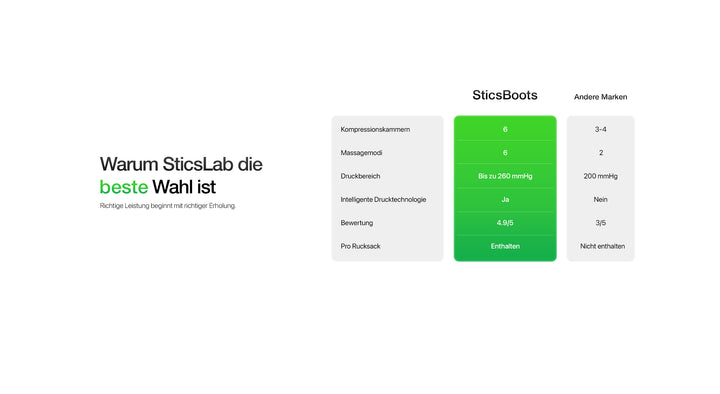 SticsBoots sind für alle gedacht, die ihren Körper fordern – insbesondere Läufer, Fußballer und Leistungssportler, die mit schweren Beinen, Muskelkater oder kurzen Regenerationsphasen zu kämpfen haben. Indem sie die Durchblutung verbessern und angestaute Müdigkeit ausleiten, helfen sie dir, schneller wieder auf die Beine zu kommen, das Verletzungsrisiko zu reduzieren und wieder einsatzbereit zu sein. Wenn du deine Regeneration genauso ernst nimmst wie dein Training, sind diese Schuhe genau das Richtige für dich.