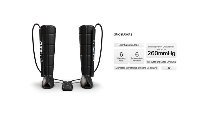 Die SticsBoots bieten eine präzise Kompressionstherapie für das gesamte Bein mit 6 Massagemodi und 6 Kammern, die darauf ausgelegt sind, Schmerzen zu lindern, die Durchblutung zu verbessern und Ihre Genesung zu beschleunigen.